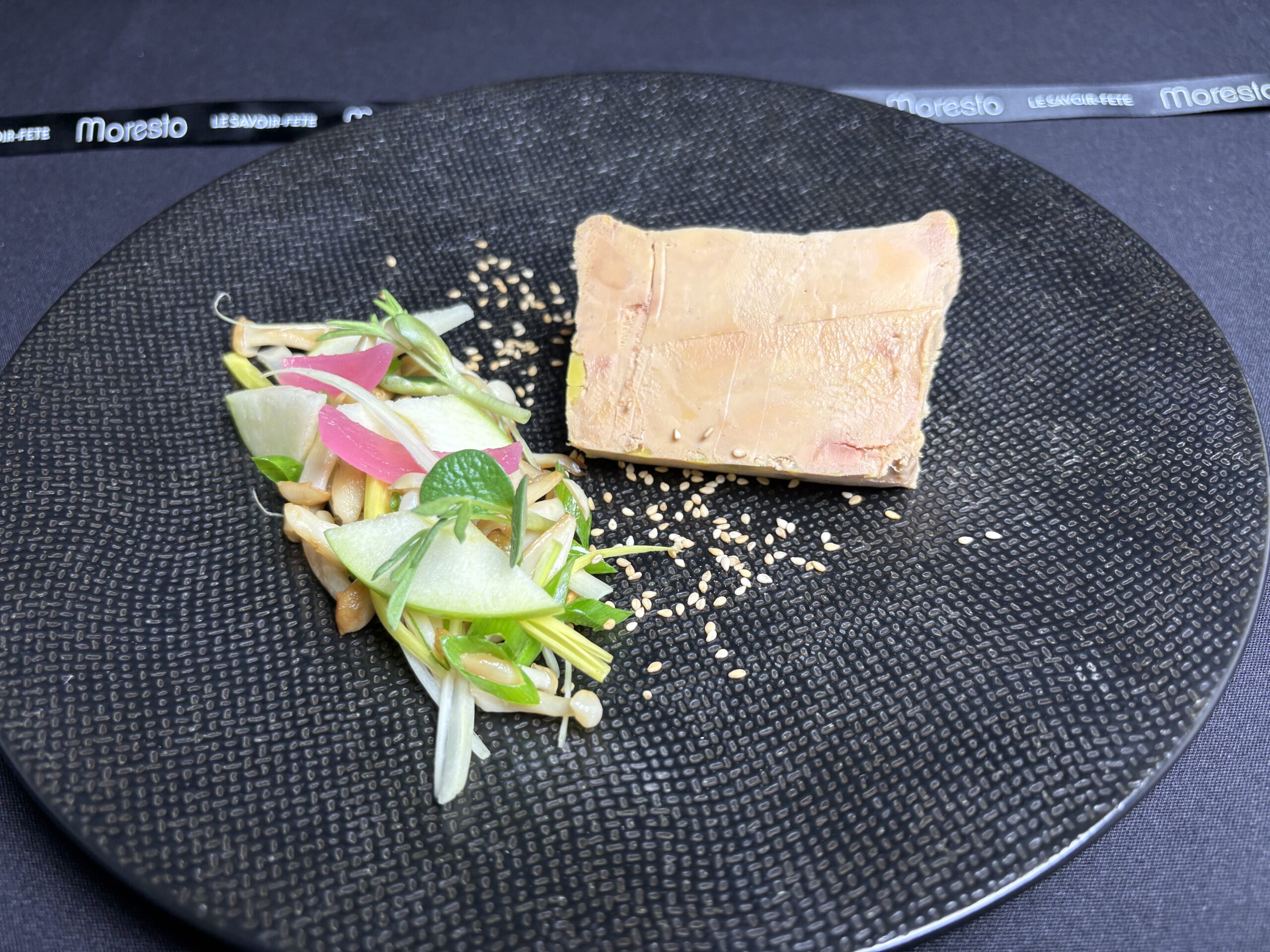 Assiette de Foie gras de Canard frais maison, Confit d’Oignon, Sésame torréfié, salade de Shimeji et Granny Smith au Yuzu