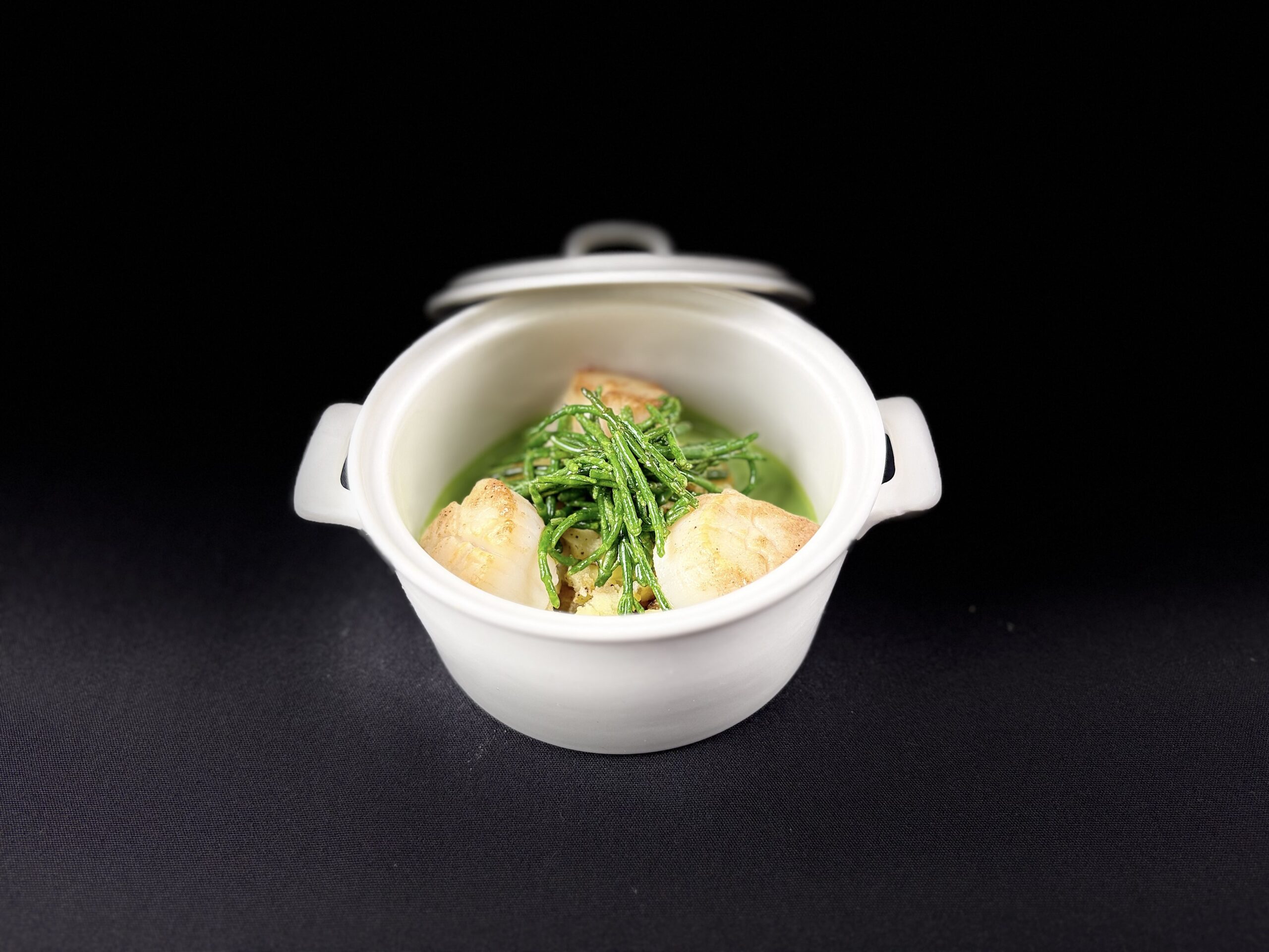Saint-Jacques, Salicorne, Crème de Persil, Brunoise de Rattes du Touquet à la graisse de Canard
