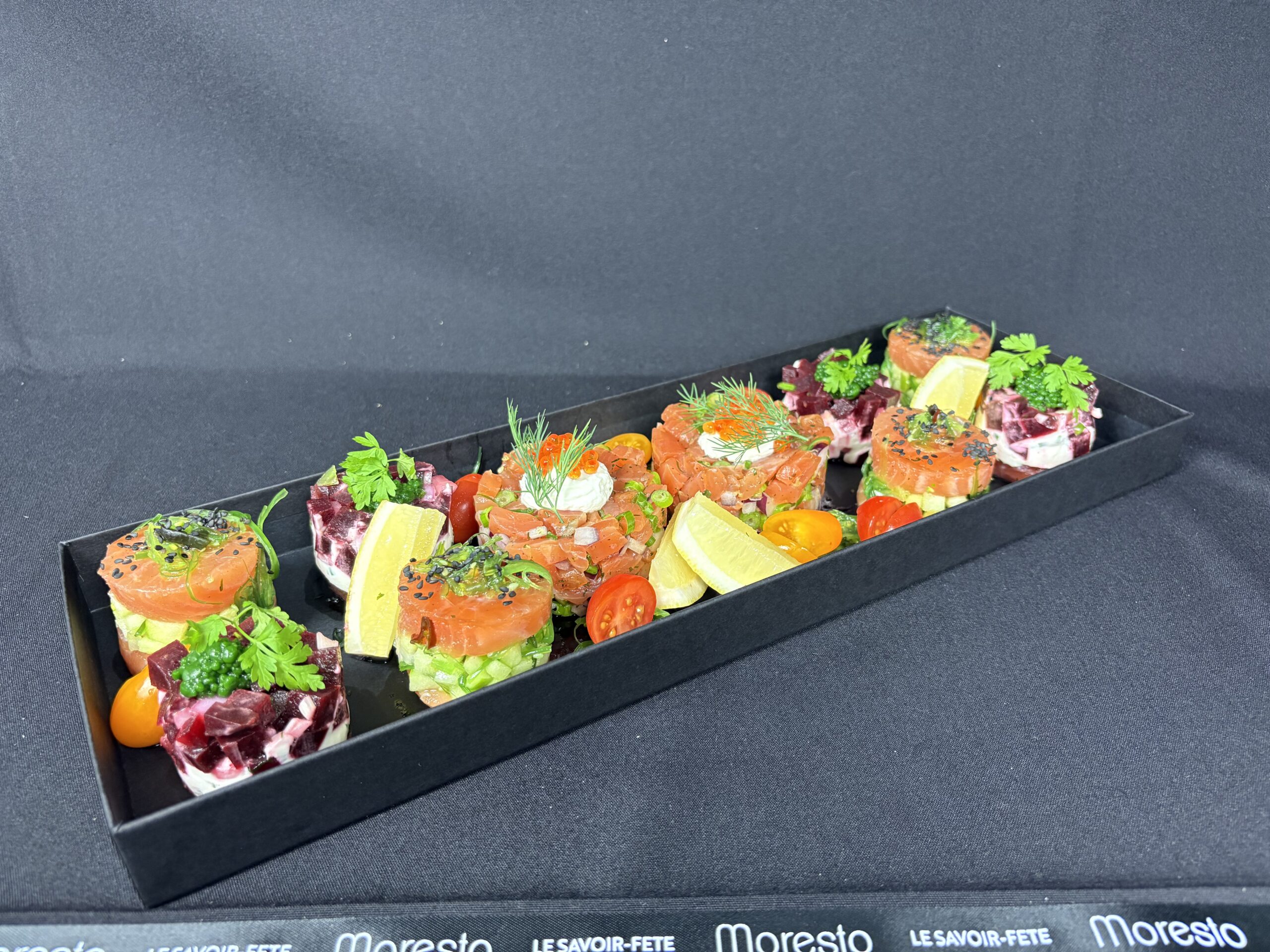 Tartare de Saumon mariné aux Agrumes et Chlorophylle, Gravelax de Saumon au Chèvre et Betterave, Saumon aux Pommes, Yuzu et Algues Wakamé