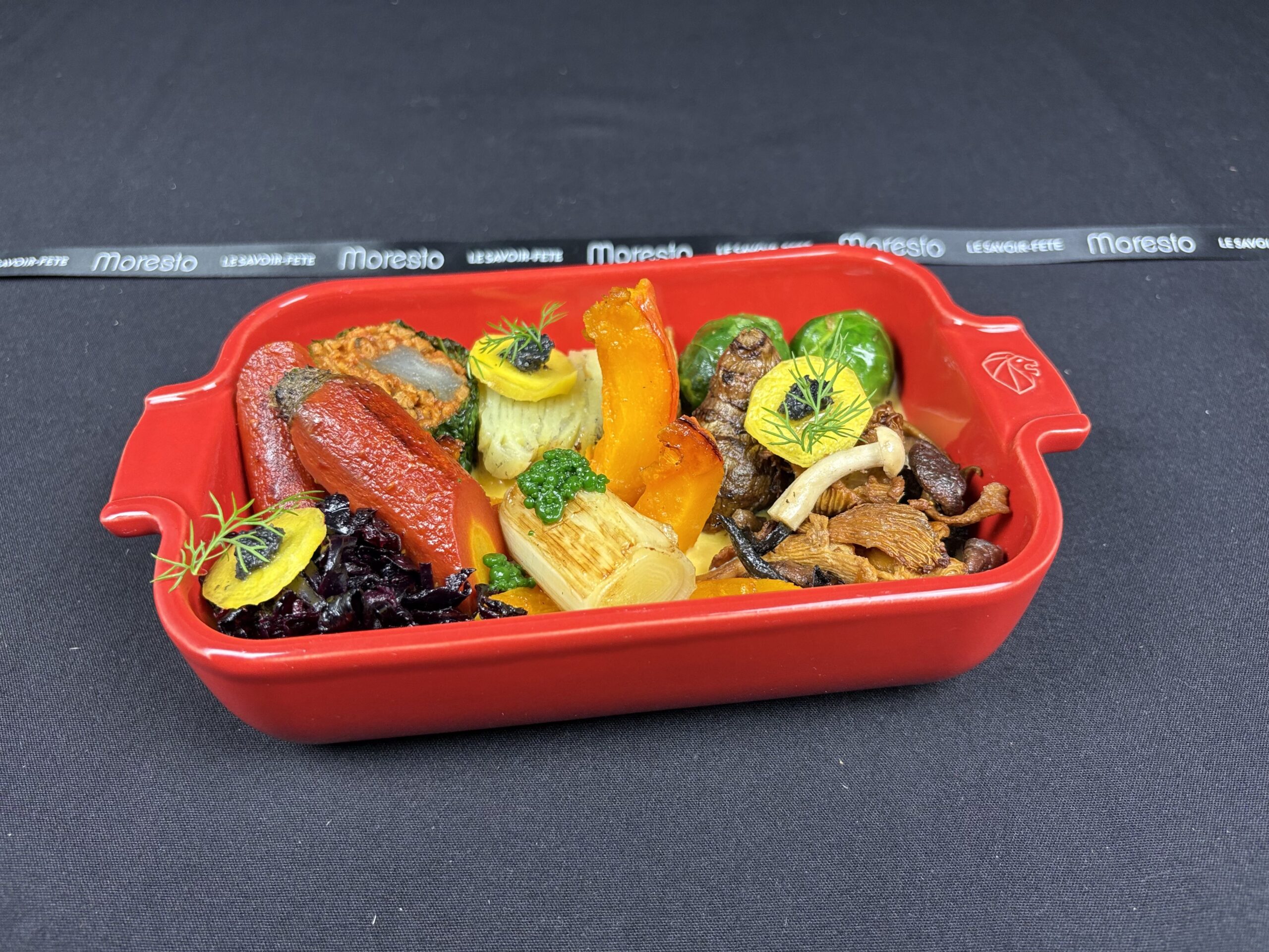 Velouté Potiron, roulé de Chou au Seitan et Echalote confite, millefeuille de Pomme de terre parfumé à la Truffe, Champignons des bois, Topinambour confit, Potimarron braisé, Poireau grillé, Chou rouge confit, Carottes rouge et jaune