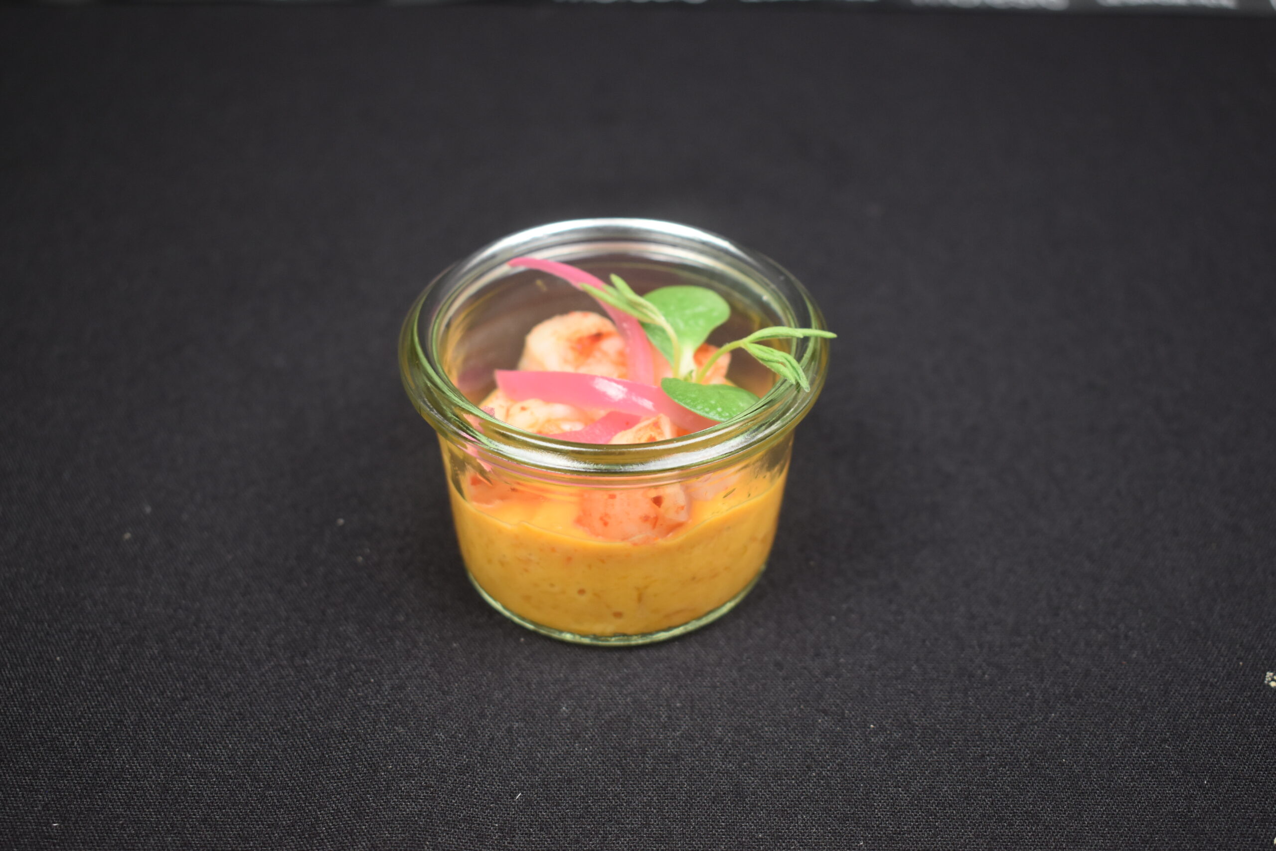 Verrine de Luxe : Butternut coco, Fricassée de Gambas, Pickles du Potager