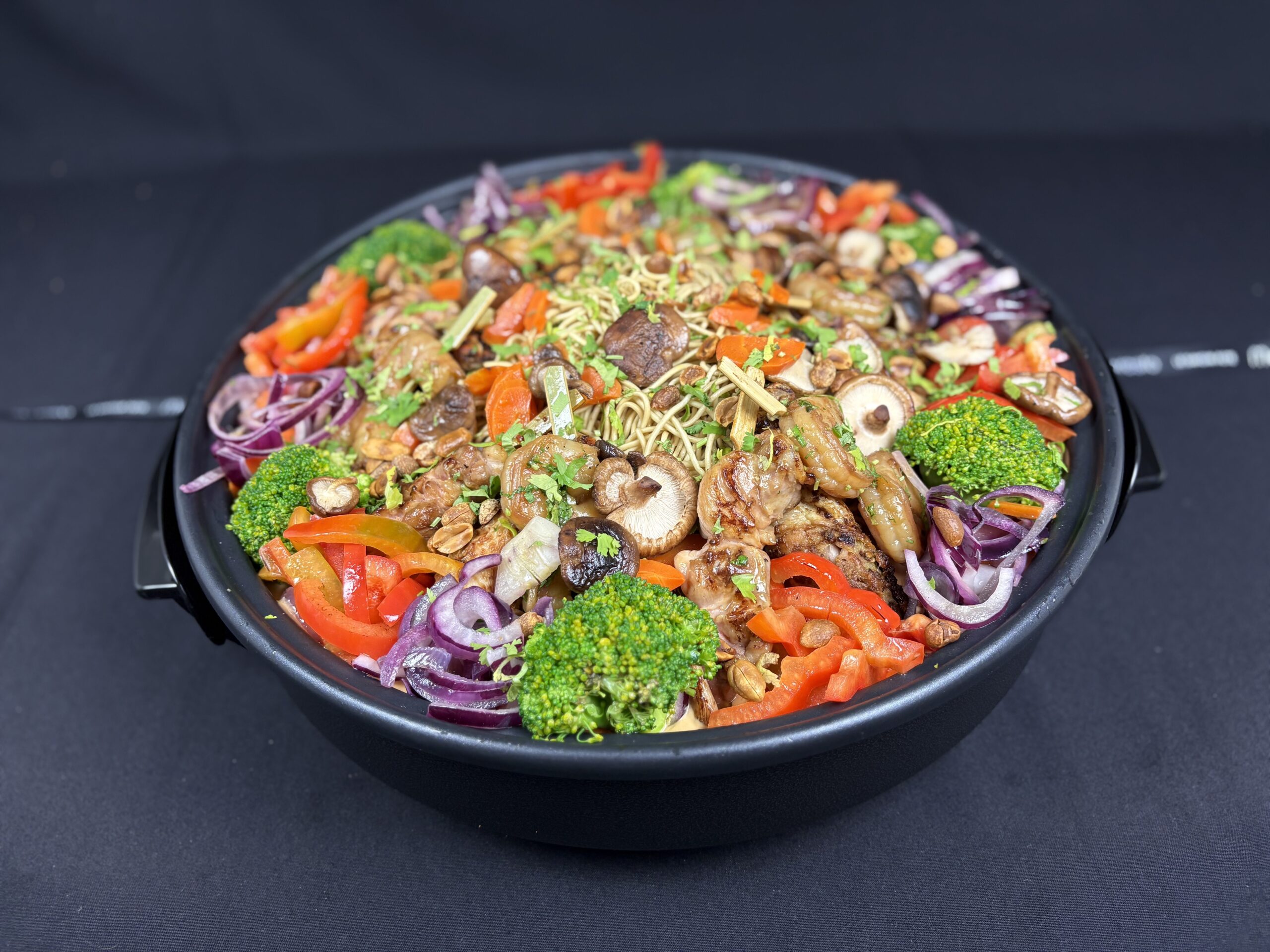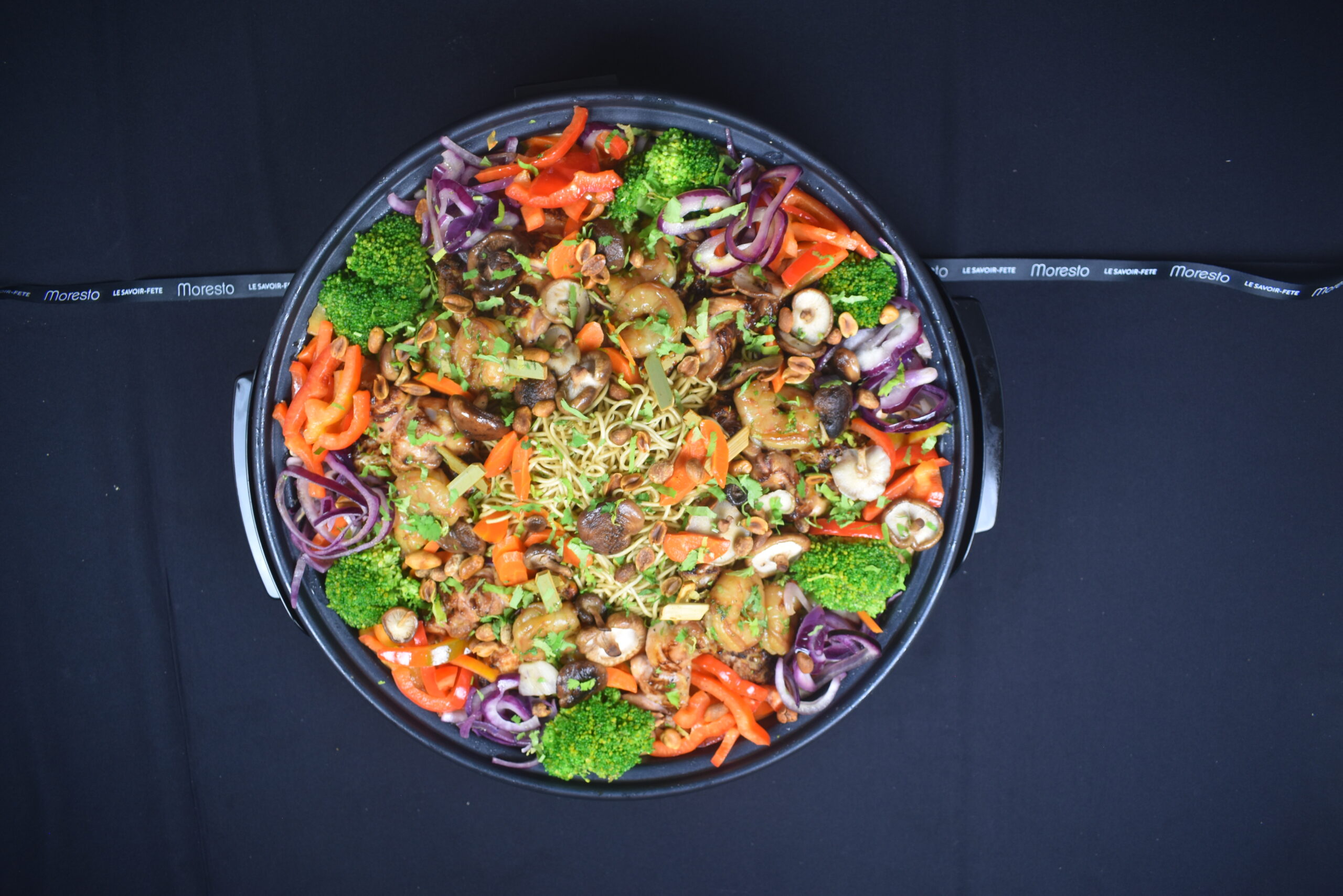 Pilons de Volaille au curry vert, Brochettes de Scampis à la Coriandre, Nouilles chinoises, Shiitaké, Poivron rouge, Oignon rouge, Brocoli, Carottes, sauce Massaman